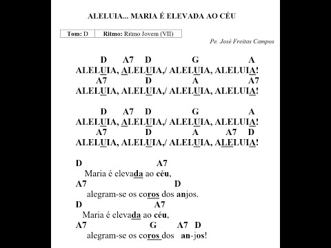 D A7 D G A ALELUIA, ALELUIA,/ ALELUIA, ALELUIA! A7 D A A7 ALELUIA, ALELUIA,/ ALELUIA, ALELUIA! D A7 D G A ALELUIA, ALELUIA,/ ALELUIA, ALELUIA! A7 D A A7 D ALELUIA, ALELUIA,/ ALELUIA, ALELUIA! D A7 Maria é elevada ao céu, A7 D alegram-se os coros dos anjos. D A7 Maria é elevada ao céu, A7 G A7 D alegram-se os coros dos an-jos!